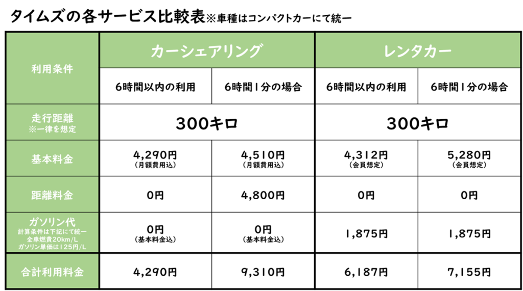 ざっくりと、タイムズのカーシェアリングとレンタカーを利用した場合の金額を試算してみましたので、ぜひ参考にしてください。