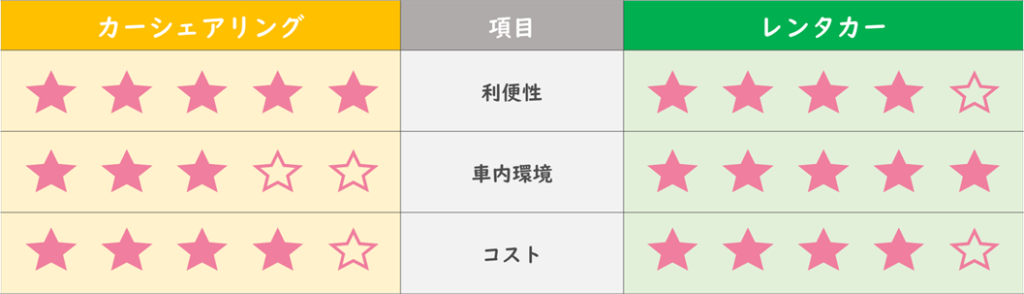 このような特徴があります。レンタカーの場合は、日常的な利用ではなく、旅行や長時間のドライブ時に利用したいサービスと言えます。